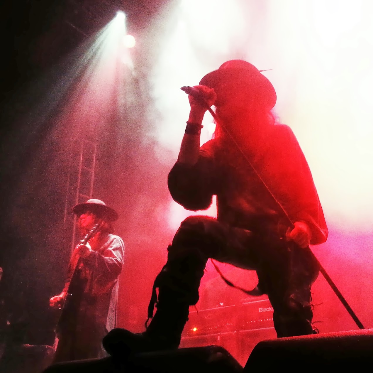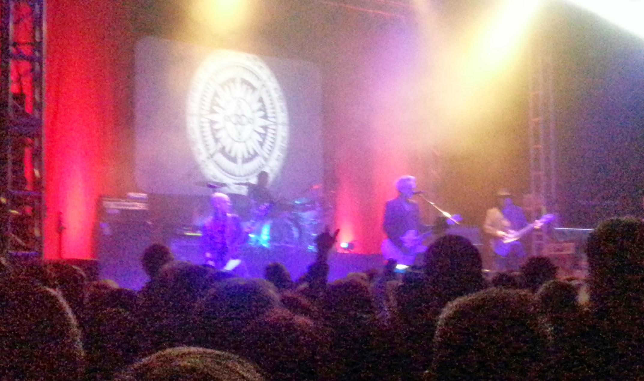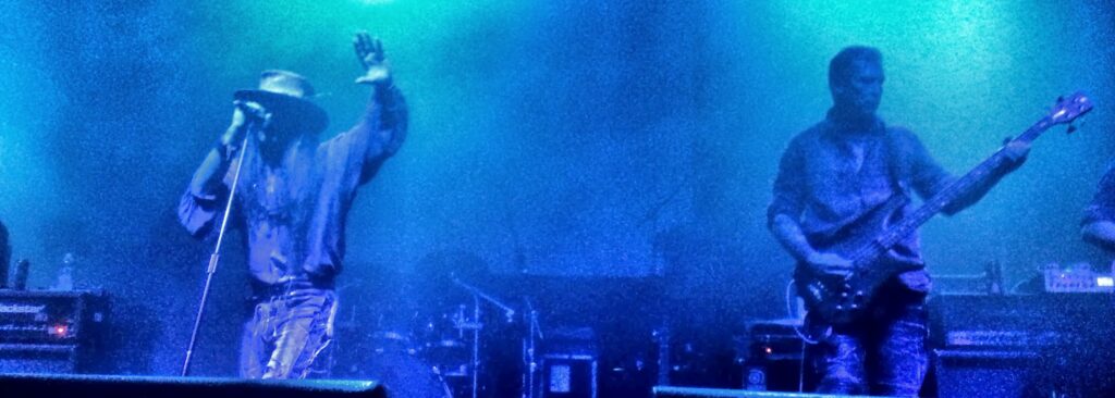 Avec The Mission, qui jouait à domicile comme l’a immédiatement rappelé Wayne Hussey, l’ambiance changeait radicalement. Si l’intro lourde et stridente assurait une belle transition avec la prestation des Fields, les guitares clinquantes de Wayne et Simon nous amenaient dans un univers tout de suite moins anxiogène. D’humeur badine, Wayne – qui ressemble de plus en plus à Bono – commençait par rappeler le score du jour des Reds de Liverpool (dont une écharpe trônait au pied d’un ampli) avant de taquiner allègrement Craig Adams (“lui est né ici, à Leeds, mais ensuite il est parti en vrille”). A voir s’enlacer ces deux-là on comprend ce qui fait que The Mission est un groupe qui dure : ces types sont de vrais potes, 30 ans que çà dure et cette joie d’être ensemble se partageait aisément avec une foule d’Eskimos dont la bonne moitié devait suivre le groupe depuis quasiment trois décennies également… Le contraste avec l’humeur maussade des Fields n’en devenait tout à coup que plus saisissant. Autant vous avouer que j’ai toujours fait un blocage irrationnel sur le chant de W. Hussey, ce qui explique qu’il s’agit du tout premier concert de The Mission auquel j’assiste (partiellement…) et que ma discothèque en la matière s’arrête à Carved in sand (1990). Le choix de venir voir les Fields mais aussi The Mission à Leeds n’était donc pas anodin : quitte à céder aux sirènes du hippie-goth, autant le faire dans l’antre même du goth rock britannique, puisqu’après tout, c’est bien là que tout à vraiment commencé. Alternant d’emblée les classiques des 80’s (Serpents Kiss, Severina) et les morceaux de The Brightest Light, on sent Wayne moins sûr de son coup avec ces derniers puisqu’il demande systématiquement au public s’il a aimé le morceau… je crois bien que c’est la première fois que j’entends un musicien de ce niveau demander son avis au public… Le délicieux Garden of Delight me renvoie 28 ans en arrière : au son des guitares/basse des Sisters ‘85, ne manque que la voix caverneuse du sieur Eldritch, mais celle de Wayne fait l’affaire d’un soir… La lumière céleste qui enveloppait The Mission ce soir-là ne faisait que renforcer avec cruauté la pâleur collective des Fields. C’en était trop pour moi, j’abandonnai la partie sur un Butterfly on a Wheel. Bravo Wayne, je m’avoue vaincu et, après coup, je regrette de n’avoir pas fait l’effort d’attendre que tu m’emportes Like a Hurricane.