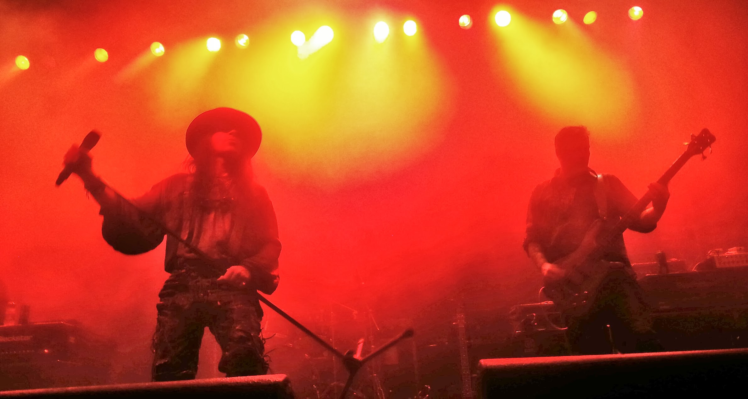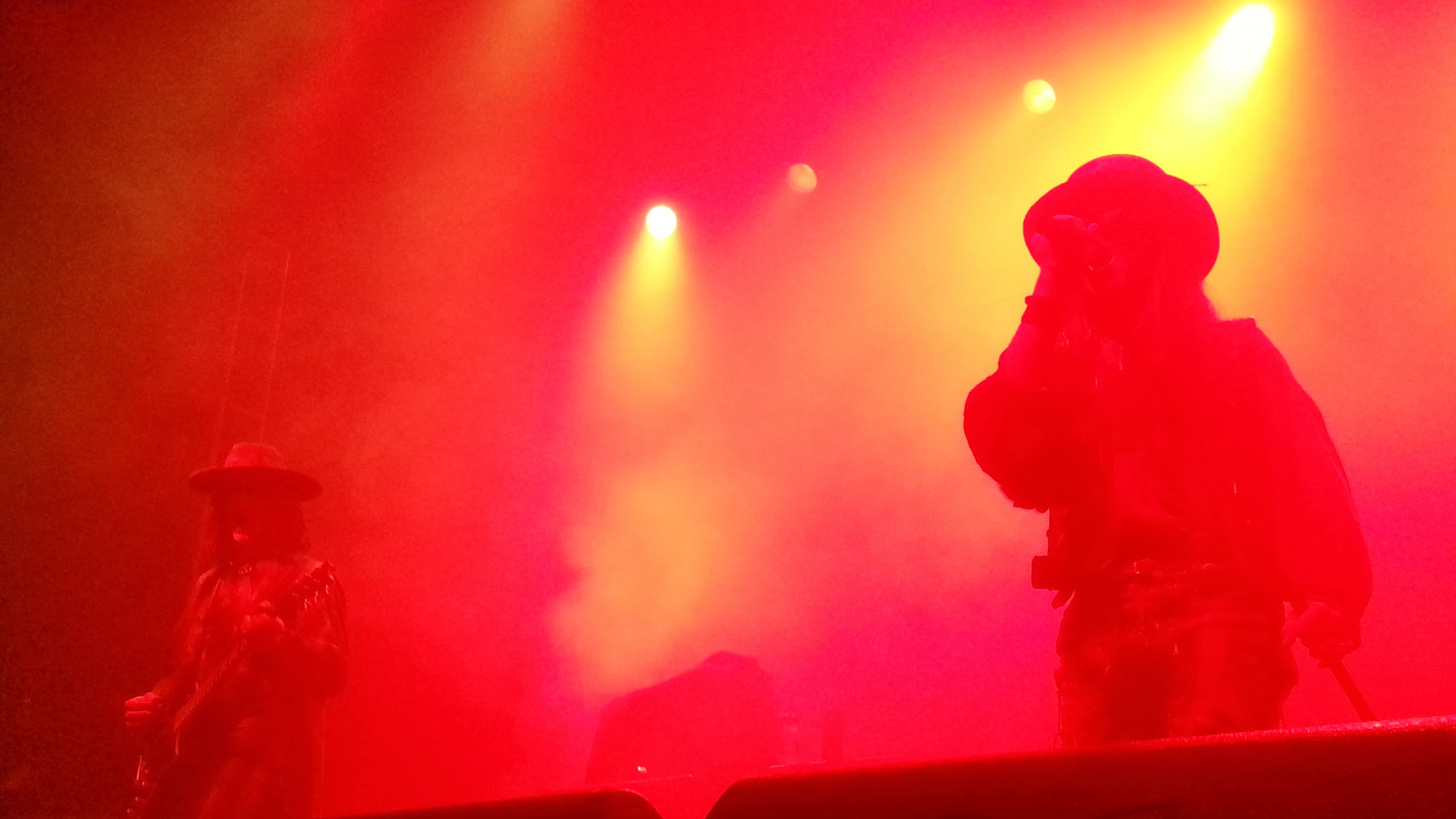 La dernière fois que j’ai vu Fields of the Nephilim sur scène c’était en janvier 1991, à Caen. Un autre siècle, un autre groupe. Au sommet de leur forme, deux mois avant le schisme qui éparpillerait ses membres au passage du rubicon, les FOTN étaient la figure de proue d’un rock gothique sauvage et mystique, possédé et envoûtant. Les formations filles hériteront d’âmes blessées se cherchant une identité neuve mais toujours empreinte d’une once de nostalgie qui, au fil du temps, avalera leurs ambitions comme Cronos dévorait ses rejetons. Le retour inattendu depuis mars 2013 du bassiste Tony Pettit aux côtés de Carl McCoy est apparu comme un possible souffle de renouveau, un sursaut de la bête originelle doublé de l’assurance d’un son de basse rond et claquant supportant les vociférations d’un McCoy que l’on dit toujours ensorcelant. Lorsque les premières notes de Dead But Dreaming résonnent et que la machine à fumée s’époumone comme jamais, on se dit qu’on y est, les Fields sont bien de retour, rien n’a changé finalement… McCoy et ses lunettes à la Mad Max, son chapeau en cuir poussiéreux et sa tignasse effilochée. A sa gauche, Tony Pettit a tombé le costume de cowboy mais sa dextérité à survoler les frettes est intacte et le son de basse tourne, visqueux et profond. Aux extrémités de la scène, deux porte-guitares qui font le job correctement : à gauche, Gav King a endossé le costume au long manteau depuis 2007 mais les dreads grossières qui dépassent de son Stetson lui donnent un faux air de Jack Sparrow qui me chagrine un peu. De l’autre côté, Andy James est techniquement au top, égrenant les accords avec la froide précision de l’homme fait machine, mais ce type semble avoir les bottes si clouées aux planches de la scène qu’il peine à donner corps à la musique ; p’tain man, fait un peu semblant d’y croire ou retourne dans ta Guitare Academy, bordel ! Chord Of Souls, For Her Light, les morceaux s’enchaînent et l’air sent de nouveau la poussière humide des parchemins. McCoy rugit, la voix est là, animale et caverneuse, bien aidée par les couches d’effets dont le Sieur abuse avec le talent qu’on lui connaît. Le rendu scénique est à la hauteur de mes attentes : glace sèche et stroboscope à gogo, ambiances volcaniques ou glaciaires se succèdent, la silhouette sombre de McCoy découpant l’espace à l’image d’un trou noir qui engloutit la lumière. Love Under Will. C’est une ambiance de feu qui anime désormais une O² Academy comble (2300 personnes), cette bâtisse gothique classée étant l’autel idéal pour la messe post-babylonienne des Nephs. Les pyramides humaines à l’équilibre précaire se succèdent et les rugissements viennent autant de la foule que de Carl lui-même. Une transe collective s’empare du public tandis que roulent les nappes d’un Psychonaut qu’on aimerait interminable. Pourtant, j’éprouve peu à peu un malaise. Un étrange sentiment de factice. Certes, le son a souffert en début de set de quelques problèmes de rumbles liés à des mauvais retours voix (qui faisaient d’ailleurs pester Mc Coy durant la balance), mais, non, ce n’est pas çà le vrai problème. Non, quelque chose n’y est pas. Une âme. Voilà ce qu’il me paraît faire défaut. L’âme des Fields. Où est-elle ? FOTN est-il encore un groupe au sens systémique du terme ? J’avoue m’être posé la question plusieurs fois durant le show. En effet, à aucun moment je n’ai ressenti la force supérieure du collectif, celle du gang des chapeaux enfarinés de la tournée Elizium dont le souvenir restera à jamais gravé au fer rouge : quatre frontmen alignés sur scène comme l’étaient les Sept mercenaires à l’écran, quatre hommes qui ne faisaient qu’un, avançant au rythme des sommations de Nod Wright. Sur scène ce soir, je vois des individualités, extrêmement puissantes certes, mais qui se côtoient sans jamais vraiment se rencontrer : Carl et Tony cultivent subtilement l’art de l’évitement, jamais ils ne se sont trouvés à moins d’un mètre l’un de l’autre, pas un regard échangé, pas un signe de fraternité. Je me situais là entre eux deux, littéralement à leurs pieds, et jamais je n’ai pu les réunir sur une photo à plan serré… Certes, les Fields ne sont pas les Happy Mondays et nous ne sommes pas venus assister à une franche partie de gaudriole, mais cette absence – en apparence – de ciment charnel créé un malaise qui me pèse. Cette déception relative est bien sûr toute personnelle et tient davantage à la flagrante désincarnation de l’entité FOTN qu’à la qualité de la prestation purement musicale qui reste magistrale. La foule ne s’y trompe pas d’ailleurs et vibre au son des incantations que McCoy délivre avec force car lui seul suffit pour tenir la boutique. Moonchild, en rappel, m’a semblé un peu transparent et, étrangement, il faudra attendre les ultimes minutes de Last Exit For The Lost, dernier morceau d’un set réduit comme la veille à Glasgow à moins de 70 minutes, pour que McCoy finisse par se lâcher vraiment : haranguant la foule des deux mains et l’implorant de lever les bras, ce fut le seul éclair temporel durant lequel un faisceau d’énergie circulait sensiblement de la scène vers le public. Un appel à l’aide peut-être ? Mais existe-t-il la moindre issue pour les âmes perdues, Carl ? Les FOTN sont censés se retrouver en studio dès janvier 2014 pour enregistrer un nouvel album. A ce jour, pas un morceau n’a été composé. Au vu de l’absence d’âme collective manifeste de ce dimanche soir, j’éprouve des doutes quant au possible résultat, si résultat il saurait y avoir. Mais il est vrai que c’est souvent au plus profond des abysses que la troupe de McCoy a su puiser la force de rebondir…