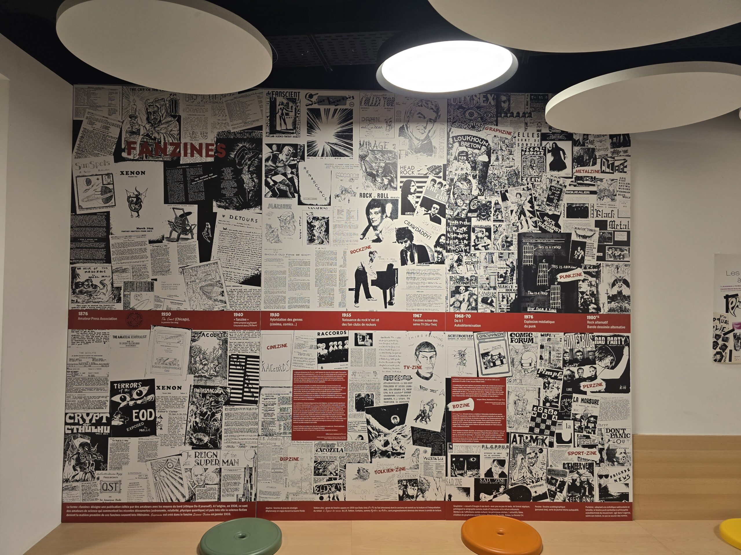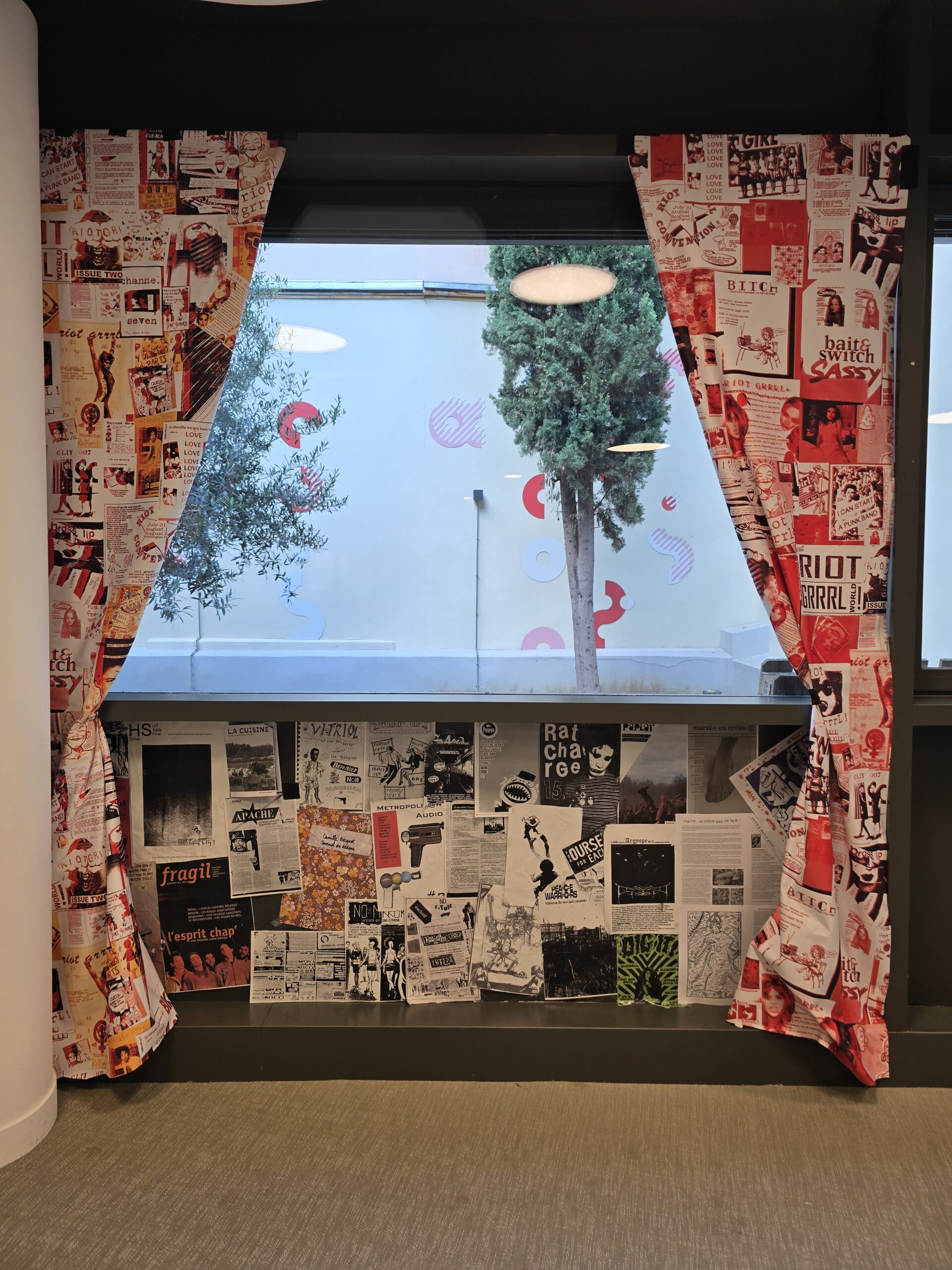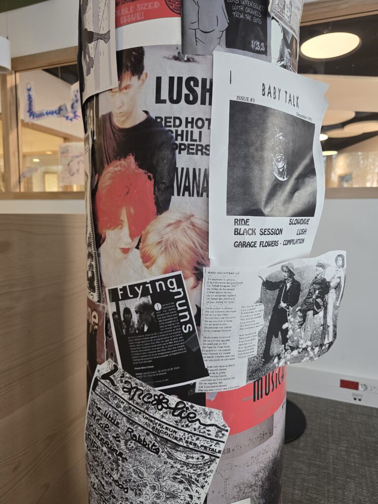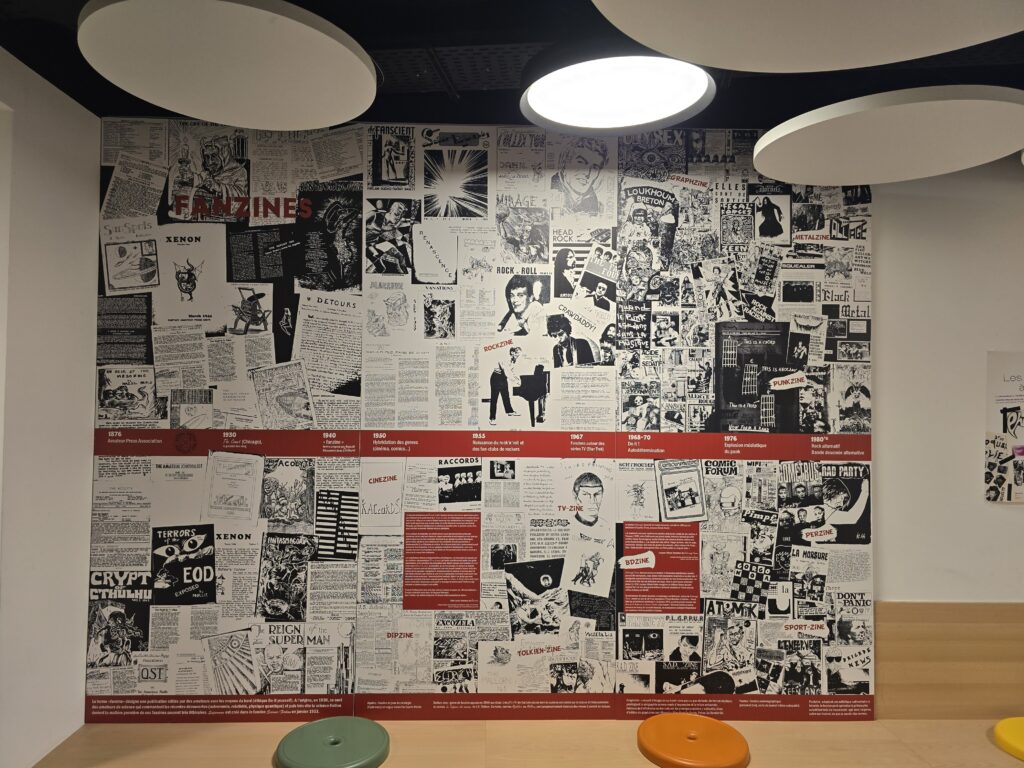 J’ai conçu l’exposition « Les fanzines à l’univ’ » à la demande du service de la vie étudiante de l’Université PSL à Paris. Zinewall historique en 4 panneaux, panneau dédié aux fanzines scientifiques, habillage de l’espace en mode riot grrrl, coin lecture de fanzines historiques.